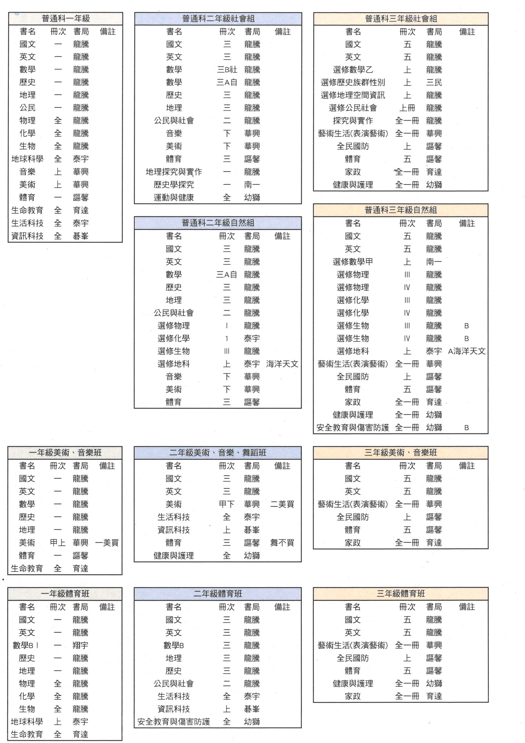 下學期:普通科、美術班、音樂班、舞蹈班、體育班