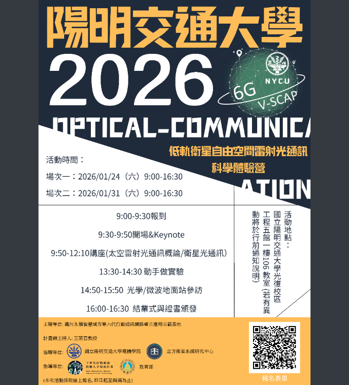 一、活動時間:(一)場次一:2026年1月24日(六)9:00-16:30。(二)場次二:2026年1月31日(六)9:00-16:30。二、活動及報到地點:國立陽明交通大學光復校區工程五館一樓106教室(300093新竹市東區大學路1001號),若有異動將於行前通知說明。三、對象與名額:對衛星光通訊有興趣,資工、電機、電子、通訊、機械等領域學生與教師為佳,每場次名額100人。四、報名方式:2026年1月3日前填寫線上表單,完成後會於活動前一週公告錄取名單。五、報名表單連結:https://forms.gle/b5RYRTqhPcKH2icy8註:學生完整參與本活動可獲得紙本營隊參與研習證明。教師完整參與本活動可獲得研習時數 6 小時,如有需求請於全國教師在 職進修網報名。研習代碼:【 5357861 】、【5357863】六、費用:本活動由教育部贊助,完成報名手續後可免費參加。七、活動聯絡人:林千喜,電子信箱:manylin0908.pt12@nycu.edu.tw。八、其他:(一)學員需自備筆記型電腦。(二)交通自理,活動將提供午餐。