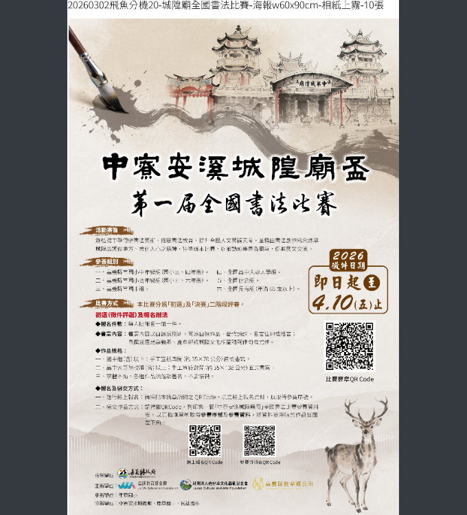 轉知轉知嘉義縣政府辦理「2026第一屆『中寮安溪城隍廟盃』全國書法比賽」 Post published:2026-03-13 Post last modified:2026-03-13 Post author:學務處幹事 Post category:B03.學務處公告 / B03a.訓育組公告 / F02.學生研習與競賽 中寮安溪城隍廟盃-全國書法比賽簡章下載 中寮安溪城隍廟盃-全國書法比賽下載 Post Views: 7 Read more articles 上一篇文章重要 114-2團體活動分配表(0313更新)下一篇文章轉知轉知文化部文化資產局辦理「115年度重要傳統表演藝術傳習結業藝生推廣活動」
