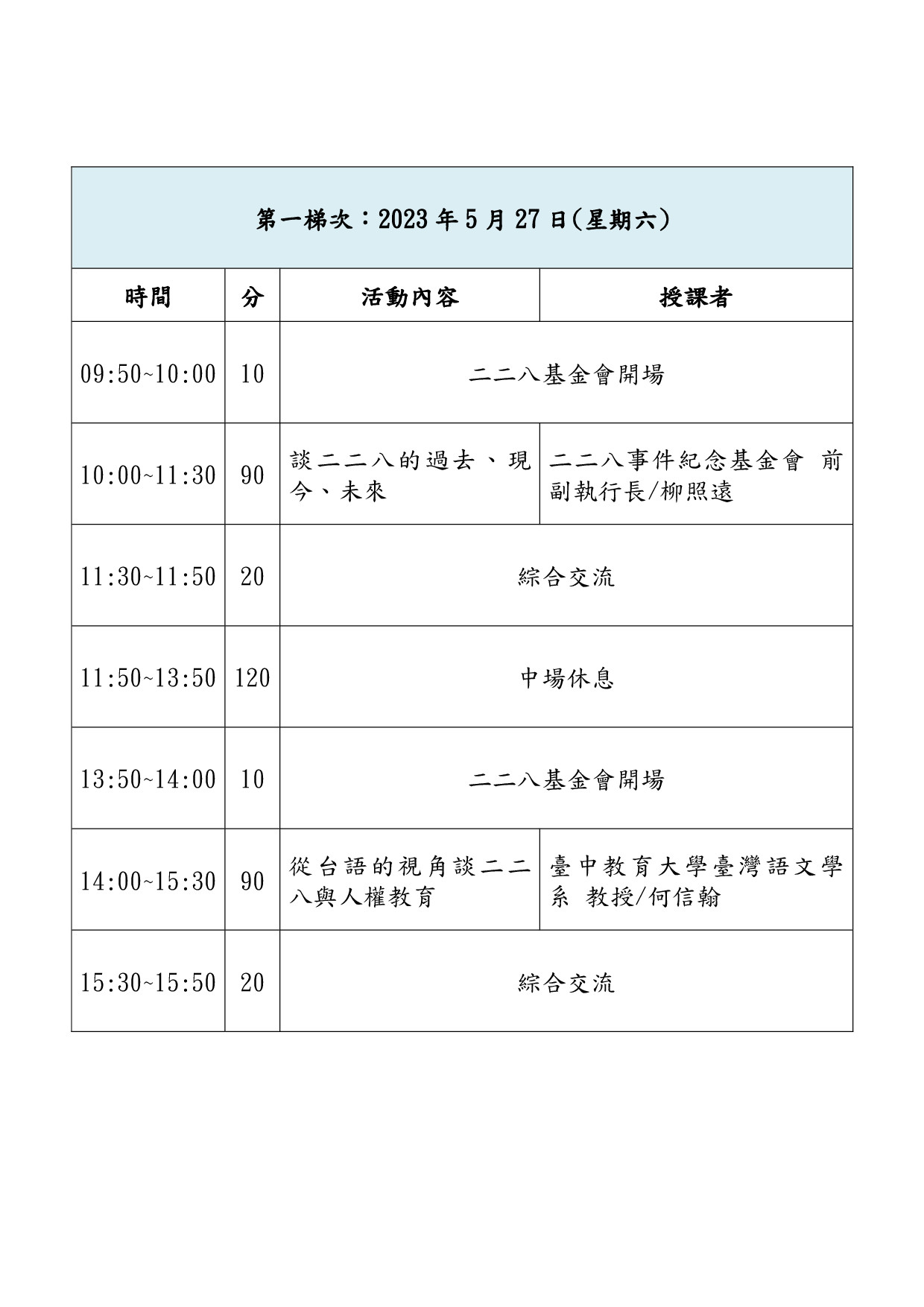 轉知 教育部國民及學前教育署函轉財團法人二二八事件紀念基金會辦理「2023年二二八人權教師研習營」活動。 Post published:2023-05-09 Post last modified:2023-05-09 Post author:學務處幹事 Post category:A03.一般公告 / B03.學務處公告 / B03a.訓育組公告 該會訂於112年5月27日(星期六)及同年11月11日(星期六)辦理旨揭活動;另因應全國新冠肺炎疫情影響,今年度將全面實施遠距研習。 228人權教師研習營簡章下載 228人權教師研習營-第一梯次課表下載 228人權教師研習營-課表2下載 Post Views: 76 Read more articles 上一篇文章轉知 國家圖書館「112年青年學者養成營」活動,請學生踴躍報名參加。下一篇文章選課普通科高二升高三彈性學習-充實補強課程選修