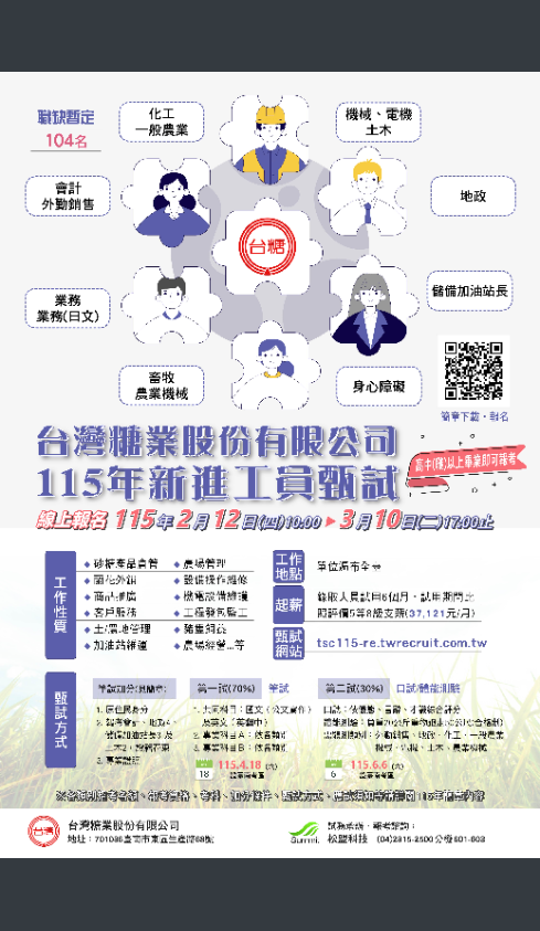 台灣糖業股份有限公司 115 年新進工員甄試資訊 Post published:2026-02-11 Post last modified:2026-02-11 Post author:人事室組員 Post category:A03.一般公告 / B09.人事室公告 0200003A00_ATTCH1-1下載 下載-1下載 Post Views: 4 Read more articles 上一篇文章重要本校115年約僱護理人員初試名單下一篇文章法鼓學校財團法人法鼓文理學院-115學年度「社會企業與創新碩士學位學程」資訊
