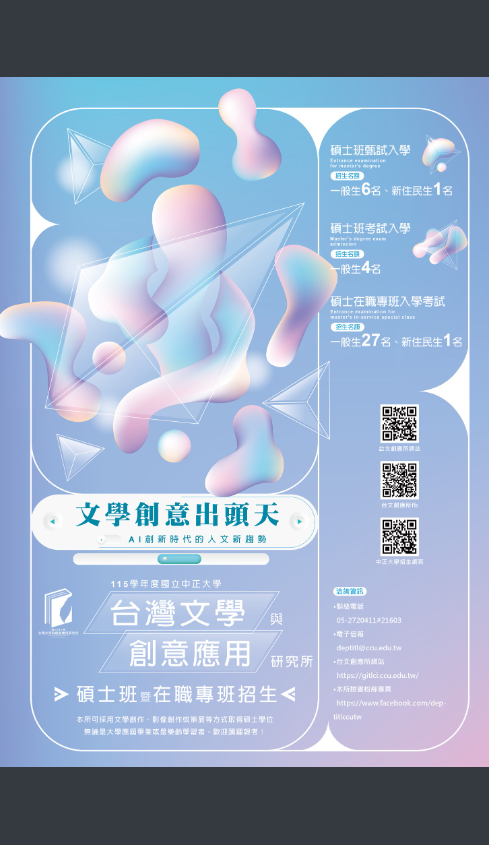轉知 國立中正大學台灣文學與創意應用研究所115學年度碩士在職專班招生資訊 Post published:2025-12-15 Post last modified:2025-12-15 Post author:人事室組員 Post category:A03.一般公告 / B09.人事室公告 來文-19下載 海報-1下載 A09030000E_1140134557_senddoc1_Attach1下載 Post Views: 12 Read more articles 上一篇文章轉知 客家委員會補助全國公務人員、教育人員及軍警人員參加客語能力認證報名費作業要點下一篇文章轉知 國立臺北大學「小旅人悠然法語班」招生簡章