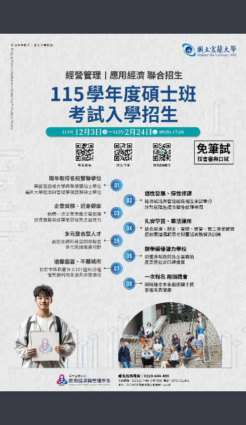 轉知 國立宜蘭大學應用經濟與管理學系研究所碩士班招生資訊 Post published:2026-01-07 Post last modified:2026-01-07 Post author:人事室組員 Post category:A03.一般公告 / B09.人事室公告 來文-5下載 招生海報下載 Post Views: 18 Read more articles 上一篇文章轉知 考選部「公務人員考試懶人包」宣導資源下一篇文章重要114學年第1學期第3次段考範圍/配分(更新中)