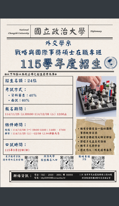 轉知 國立政治大學 外交學系戰略與國際事務碩士在職專班 Post published:2025-11-13 Post last modified:2025-11-13 Post author:人事室組員 Post category:A03.一般公告 / B09.人事室公告 公文製作下載 海報-3下載 Post Views: 26 Read more articles 上一篇文章轉知 財團法人台灣設計研究院辦理「境善.境美-學習環境美感涵養計畫」之環境美感增能應用課程下一篇文章轉知 國立政治大學中國文學系「國文教學碩士在職專班」115學年度招生資訊