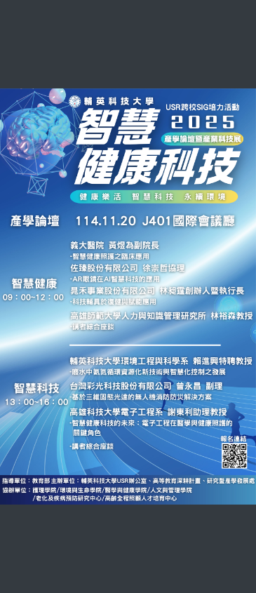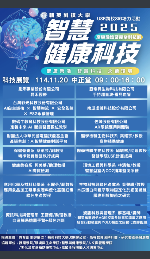 轉知 輔英科技大學 辦理USR x SIG培力活動「2025智慧健康科技產學論壇暨產業科技展」 Post published:2025-11-13 Post last modified:2025-11-13 Post author:人事室組員 Post category:A03.一般公告 / B09.人事室公告 來文-21下載 海報1下載 海報2下載 論壇議程014912下載 Post Views: 22 Read more articles 上一篇文章轉知 輔仁大學 法律學院法律學系碩士在職專班115學年招生報名訊息下一篇文章轉知財團法人開放文化基金會辦理「2026 年SITCON 學生計算機年會」
