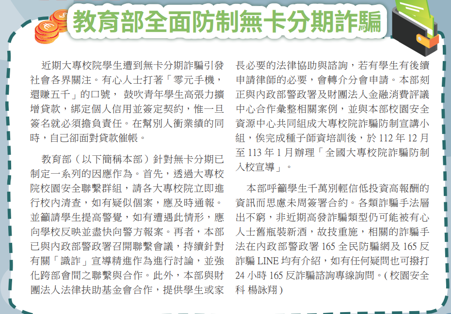 防詐騙宣導-「教育部全面防制無卡分期詐騙」 Post published:2024-01-03 Post last modified:2024-01-03 Post author:學務處生輔組長 Post category:A.校園公告 / A03.一般公告 宣導資料如下圖,請自行參閱. 教育部防制詐騙專區連結,歡迎大家多加利用. Post Views: 70 Read more articles 上一篇文章轉知國立中山大學電機系系友會113年度「系友在學子女獎學金」申請事宜下一篇文章轉知國立中山大學公事所112學年第2學期「公共事務管理碩士學分班(澎湖組)」開始招生