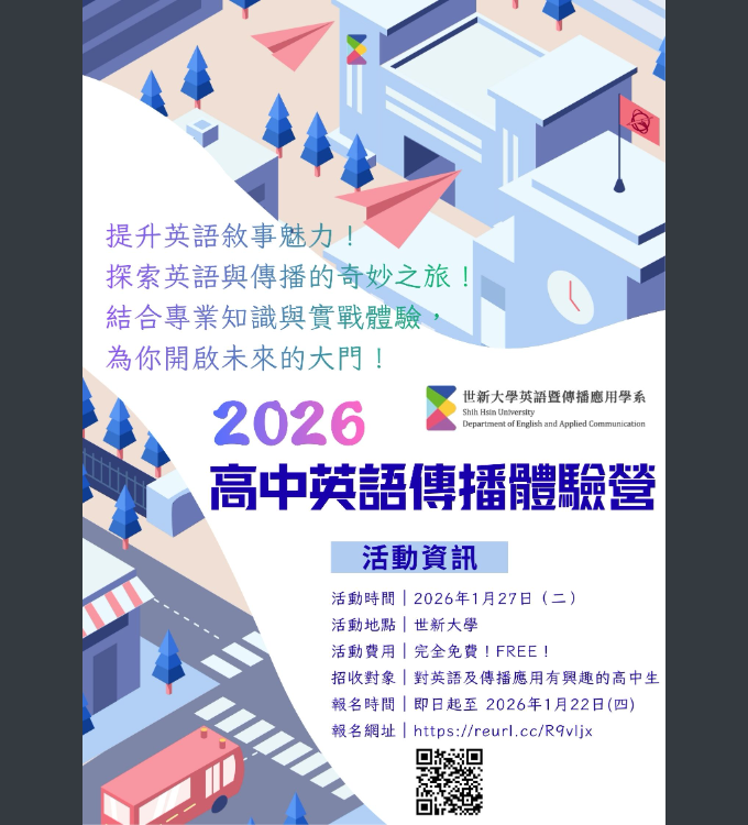 轉知世新大學英語暨傳播應用學系辦理「2026高中英語傳播體驗營」 Post published:2025-12-19 Post last modified:2025-12-19 Post author:學務處幹事 Post category:B03.學務處公告 / B03a.訓育組公告 / F03.生活與藝文 活動資訊(一)活動名稱:2026高中英語傳播體驗營。(二)報名時間:即日起至115年1月22日止。(三)活動日期:115年1月27日。(四)活動地點:世新大學。(五)活動網頁:https://dteng.wp.shu.edu.tw/?p=5080。 世新大學-高中英語傳播體驗營簡章下載 世新大學-高中英語傳播體驗營海報下載 Post Views: 17 Read more articles 上一篇文章轉知科博館生命科學廳暫停開放下一篇文章轉知高雄市立高雄女子高級中學(以下簡稱高雄女中)辦理「115年寒假限定|解密AI黑盒子:師生營隊」,請師生踴躍參加。